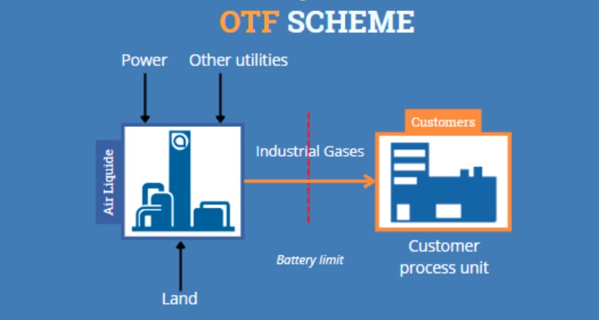 OTF (Over The Fence) is a business model in which Air Liquide invests, builds, owns, operates, and maintains assets as a producer and distributor. Through this business model, we enable our customers to drive their performance and profitability. This is our worry free solution for our customer's industrial gas needs.