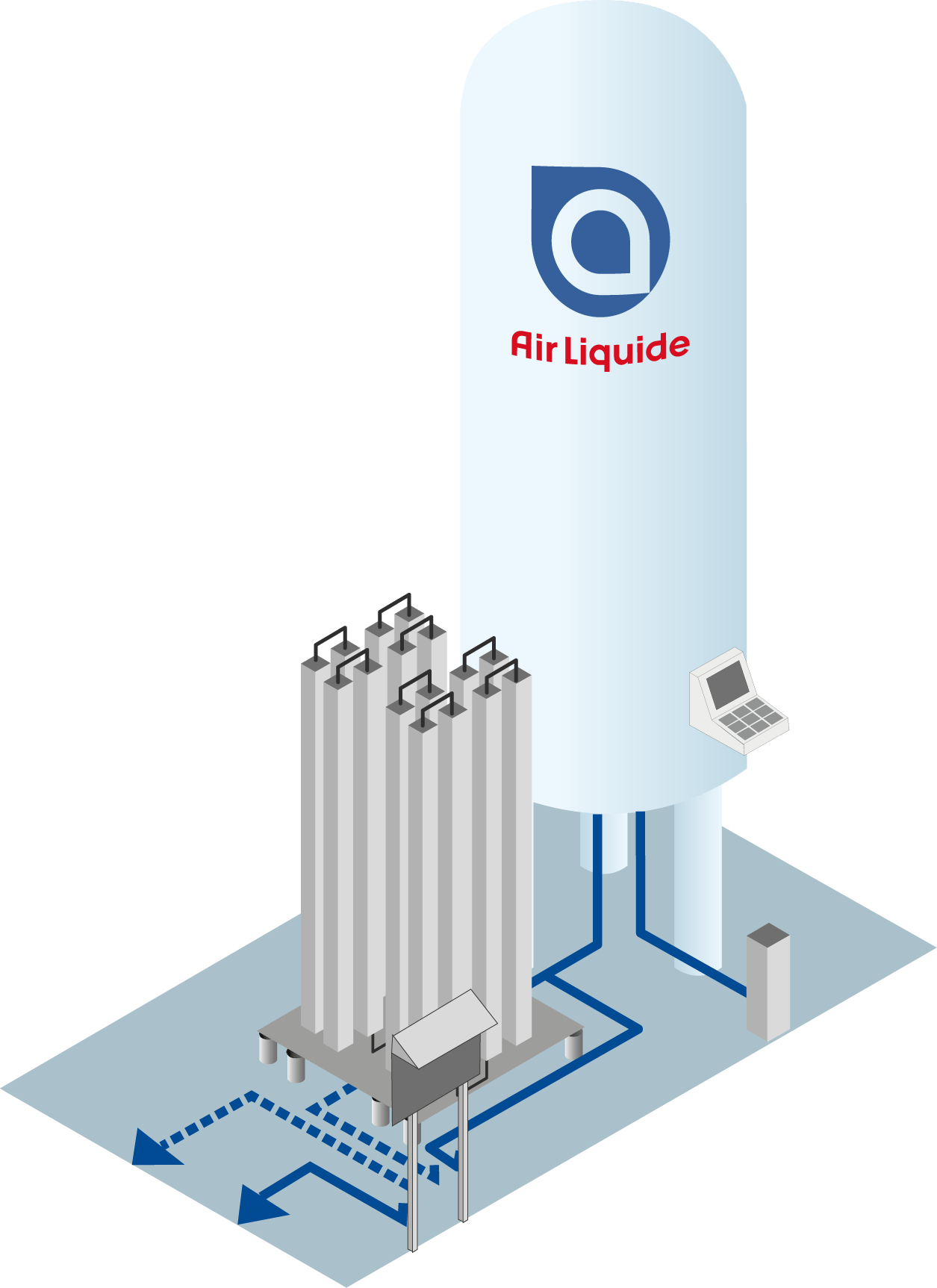 The Micro Bulk offer, which is an upgraded version of the Skid tank, is an all-in-one air gas cryogenic vessel with an integrated storage and supply system. It is most suitable for customers with high pallet usage in a single spot, ranging from 500 m³ to 100,000 m³ per month. The Micro Bulk storage system is able to accommodate pressure requirements of up to 450 psi. Air Liquide delivers the liquid safely, conveniently and effectively via dedicated Cryo Service trucks.