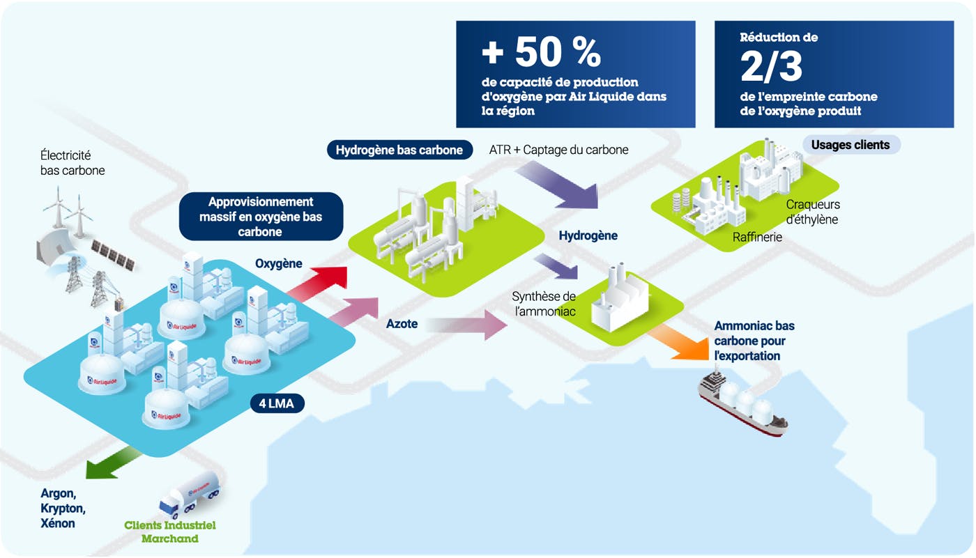 Dans le cadre de ce projet, Air Liquide exploiterait quatre unités LMA sur le site d’ExxonMobil, client stratégique du Groupe depuis trente ans. Capables de fournir un volume record de 9 000 tonnes d'oxygène par jour, ces unités alimenteraient les reformeurs auto-thermiques d'ExxonMobil pour la production d'hydrogène bas carbone. Elles fourniraient également jusqu'à 6 500 tonnes d'azote par jour pour la production d'ammoniac, une source d'énergie bas carbone destinée à l'exportation.